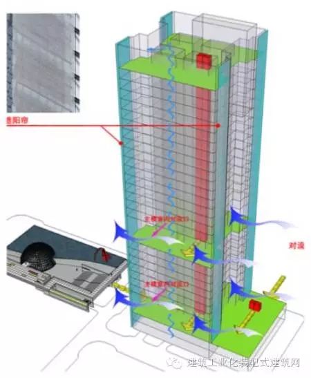 大厦外围护结构采用断热铝合金窗+Low-E中空玻璃幕墙,同时东西向采用垂直遮阳帘,南北向采用水平外遮阳,节能的同时减轻建筑自身重量;